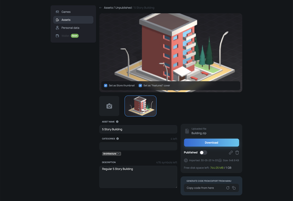 Along with the Games section, there is an Assets section on the MANU Marketplace. In this section, users can exchange assets. Assets are like “building blocks” for creating games. Assets can be objects, as well as objects combined into a group or a set of some objects (for example, to create mountains or a set of tools). All these objects (assets) can already be animated and ready to work. So, they can immediately work as a game object in the Scene (for example, bots or skeletons).