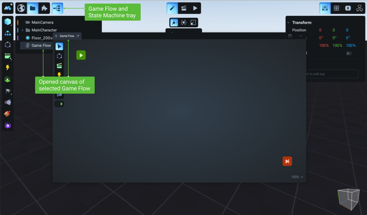To get started with Game Flow, you need to create a Game Flow object in the Stage Tree using the toolbar.