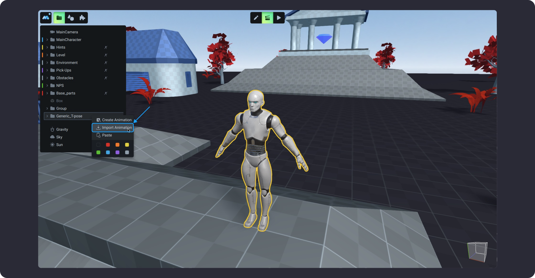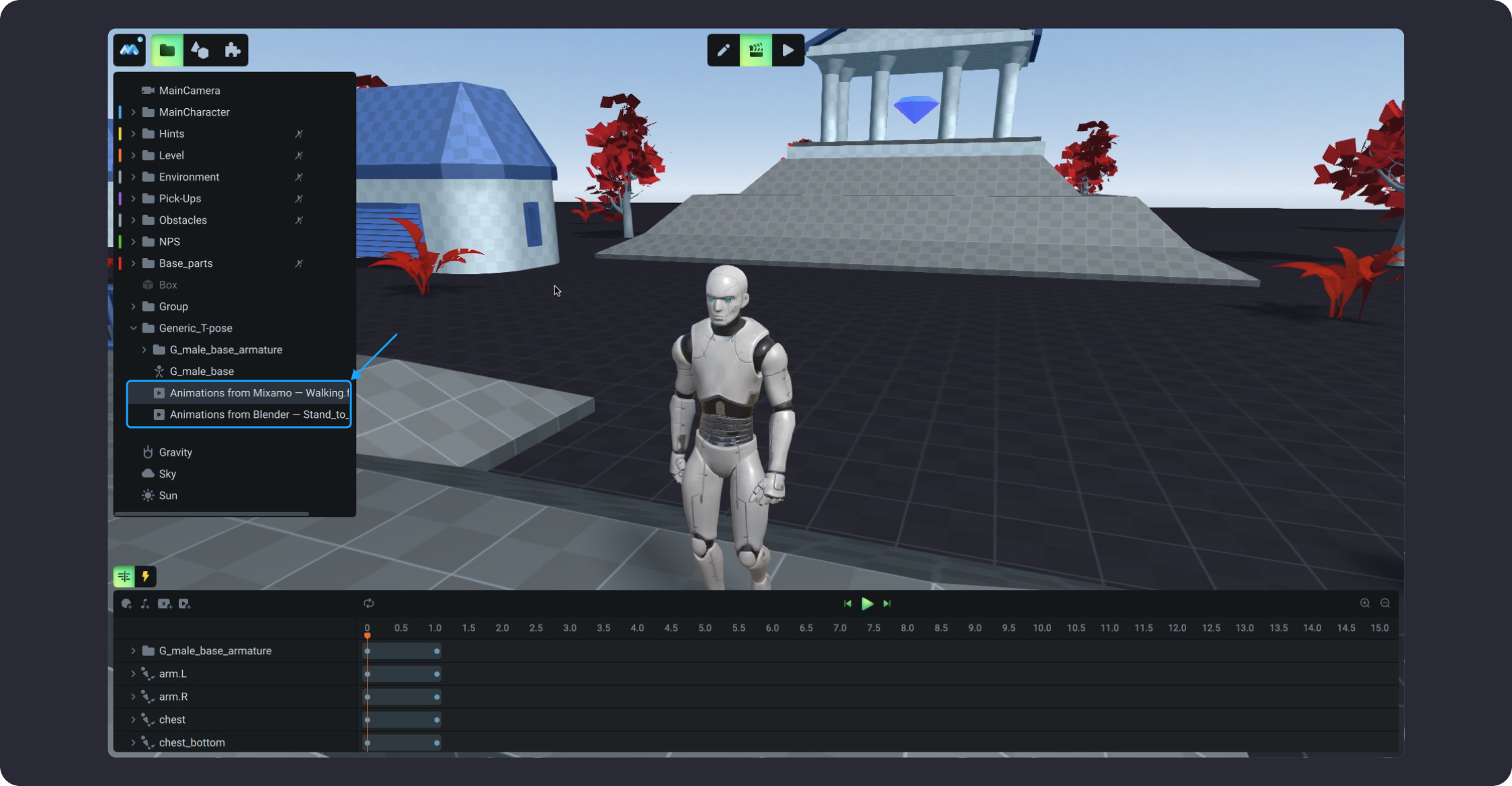 When you import a model into MANU that involves playing an animation, you also need to import the animation, since it is not imported with the model. The animation to be imported must be prepared in advance. It will be more convenient for you if the animation, imported model and everything related to it will be located in the same folder on your computer. You can prepare the animation yourself or download it from the Mixamo website. For example, the model in the screenshot above has animations from Mixamo.