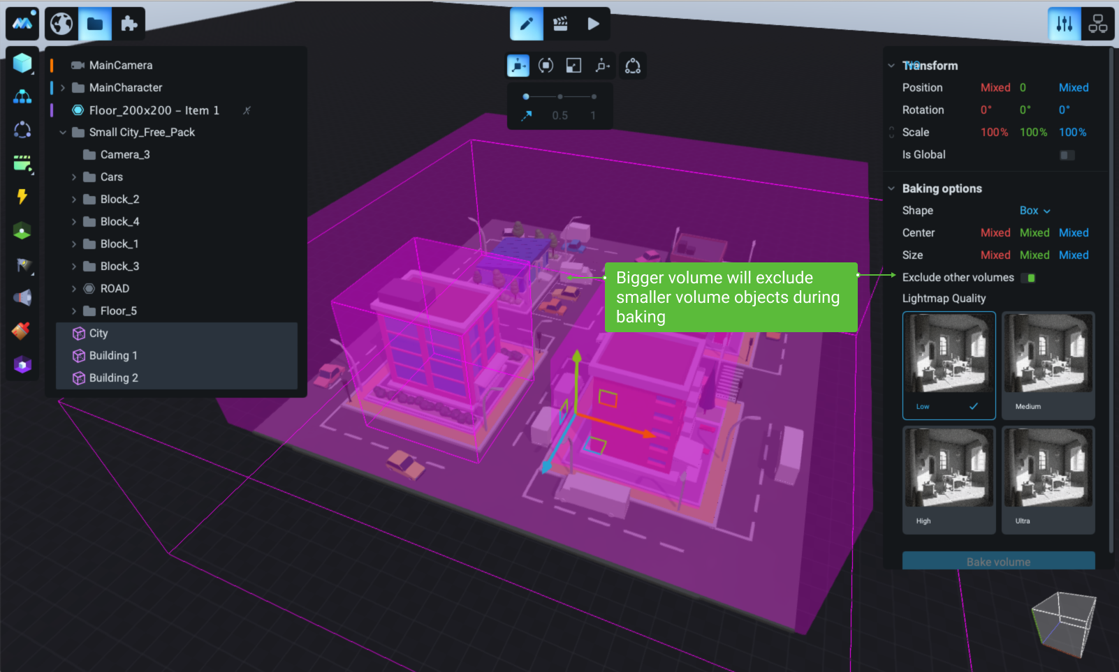 To select objects that will be baked with a certain quality, there is the Baking Volume tool. Before creating baking volumes, decide which objects require high baking quality, and which objects can be shown with lower quality.