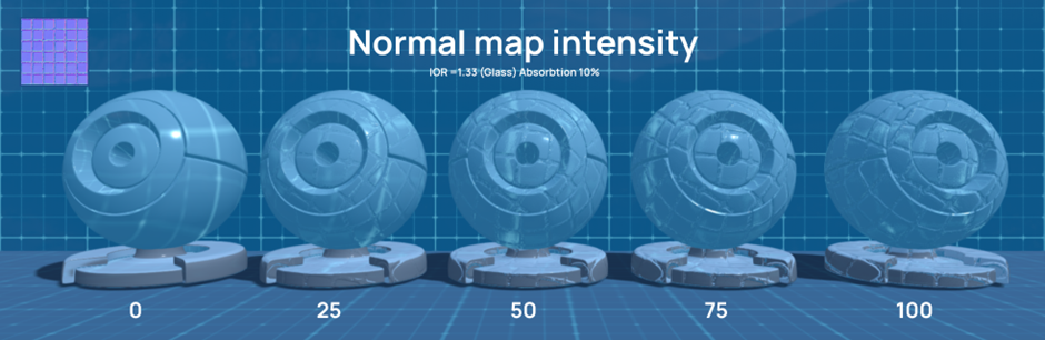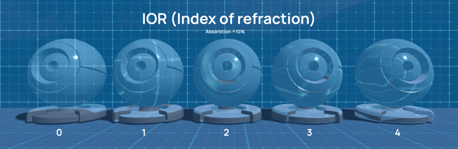 IOR is a physical quantity. It controls the degree of light refraction, the permeability through the surface of the material, and also how well the reflections are visible on materials.  If we increase the IOR (dragging the slider to the right), then we will see that the objects that are behind the glass begin to refract.