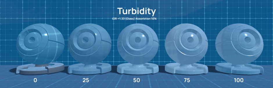 This parameter is used to create a thick piece of glass, crystal, quartz, inside which you need to show multiple re-reflections. You can also use this parameter to create ice. Ice never occurs simultaneously.  Ice looks like a monolith from the outside, but inside it is heterogeneous. Turbidity will help to create this heterogeneity.