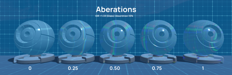 To make your glass object even more realistic, you can use the Aberation parameter. By increasing this parameter, a clear rainbow effect will appear on the glass object.