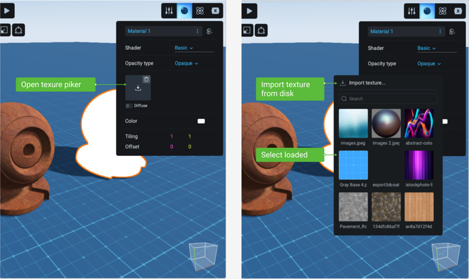 To download a texture from your computer, simply click on the Import texture option. You also can select a texture map from the texture picker.