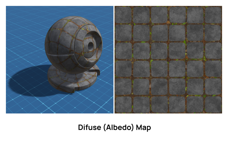 The Diffuse/Albedo map indicates what colors are in this texture. It takes the color of the objects.
