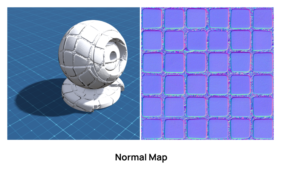 Normal map is a texture map that sets the relief for the object. This map is responsible for the light relief (bumps) on the material surface. Here, the relief is imitation. In fact, there are no bumps on the material; the geometry of the object does not change. However, due to the use of the normal map the material looks bumpy.