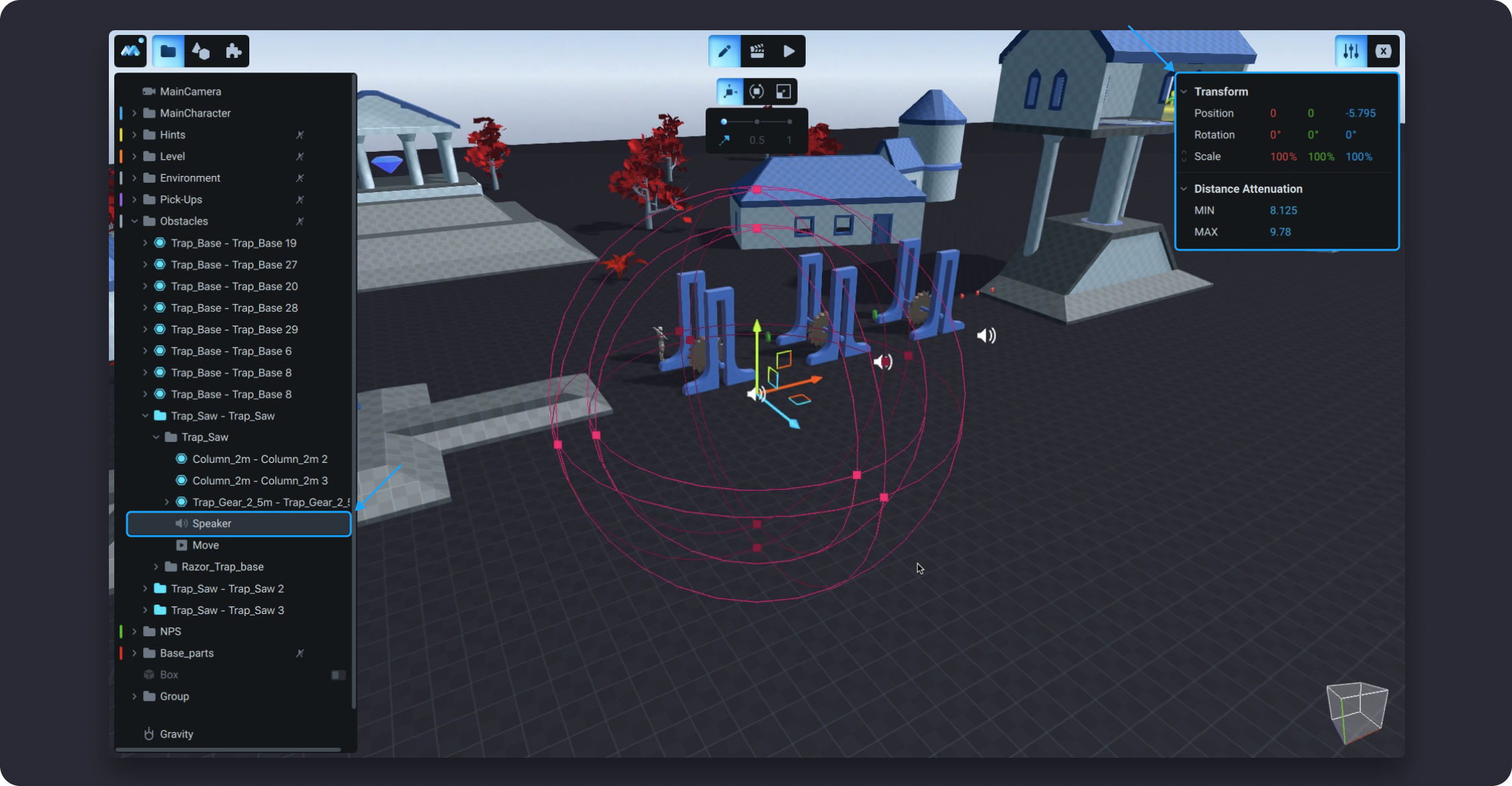 Speakers are audio sources or components that playback audio in the game. The speaker allows you to arrange the sound that will be heard only in a certain place of the scene. Moreover, you can make your character hear the sound from a particular distance and make the sound get louder the closer you get to its source. The closer the Main Character is to the speaker, the louder the sound will be.