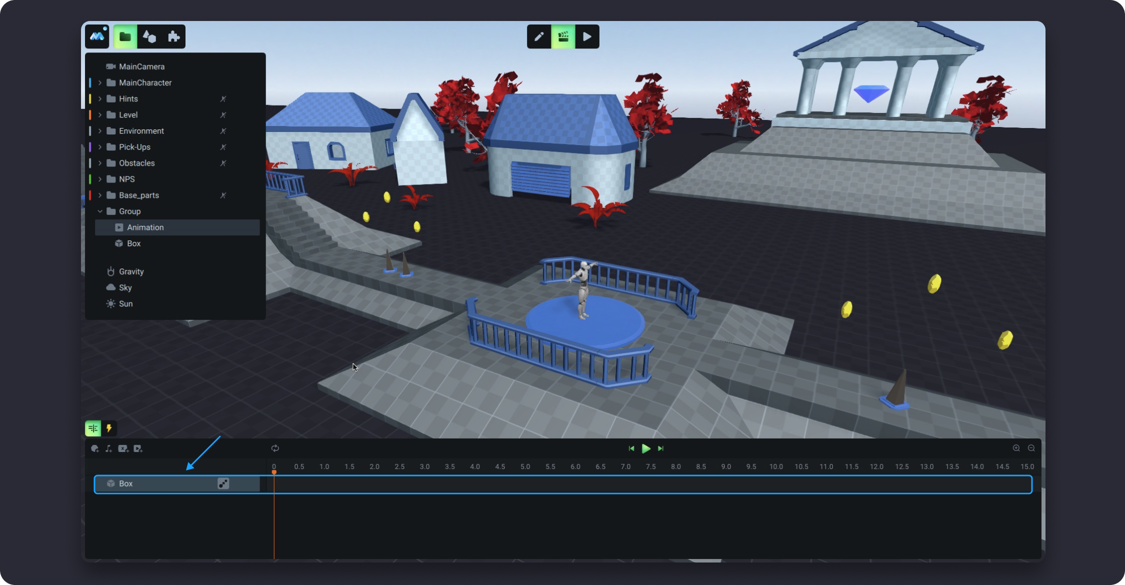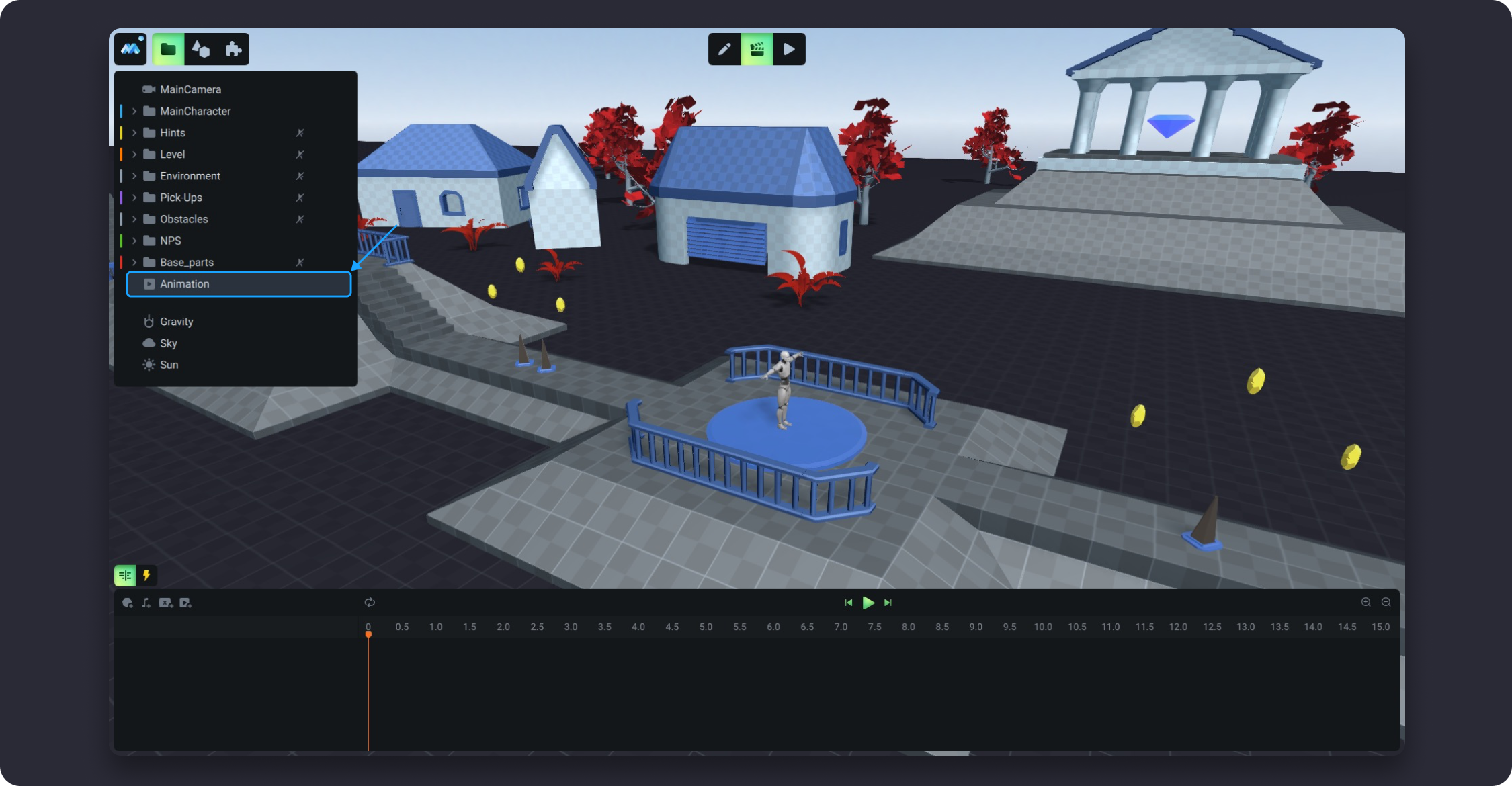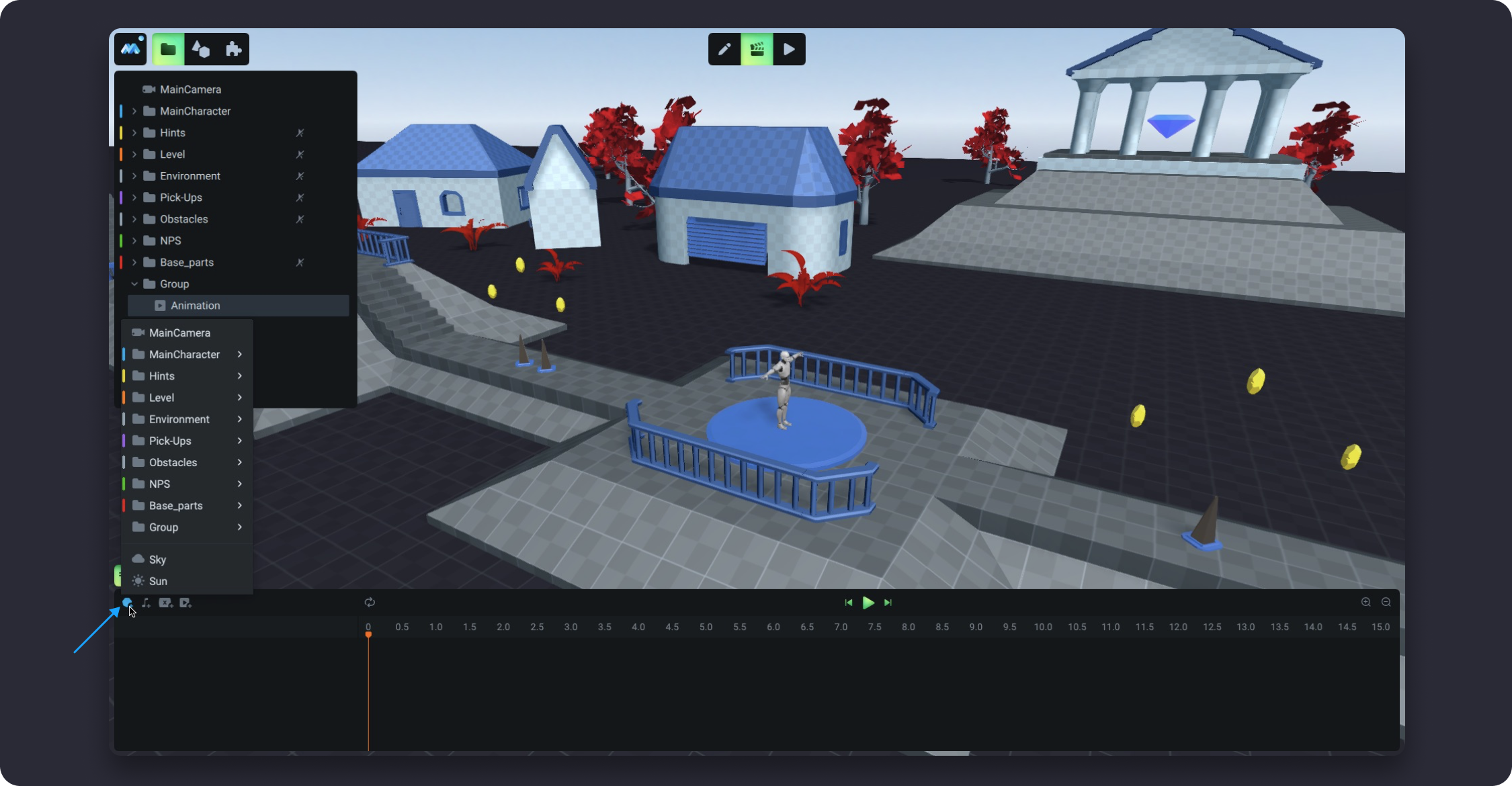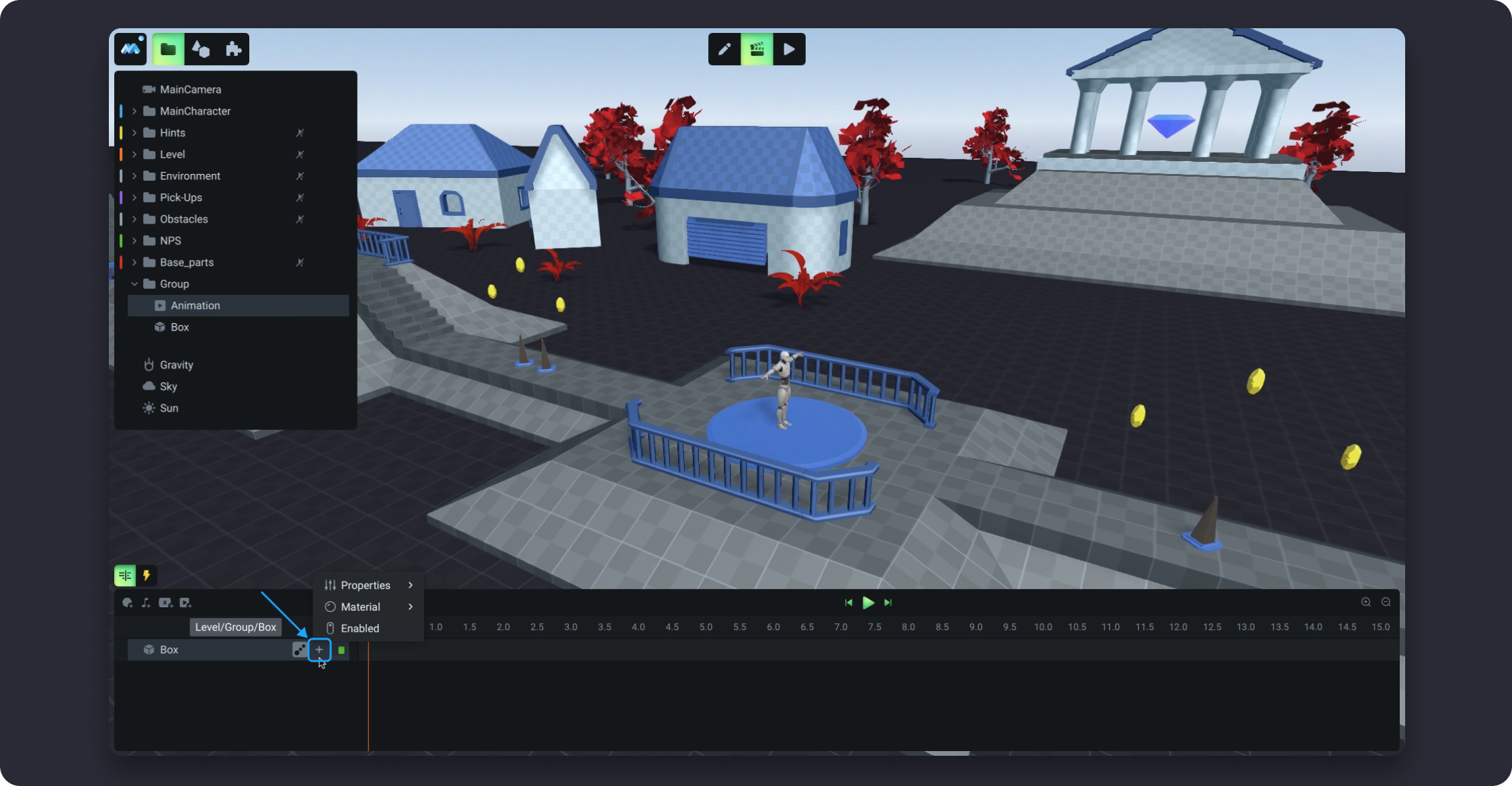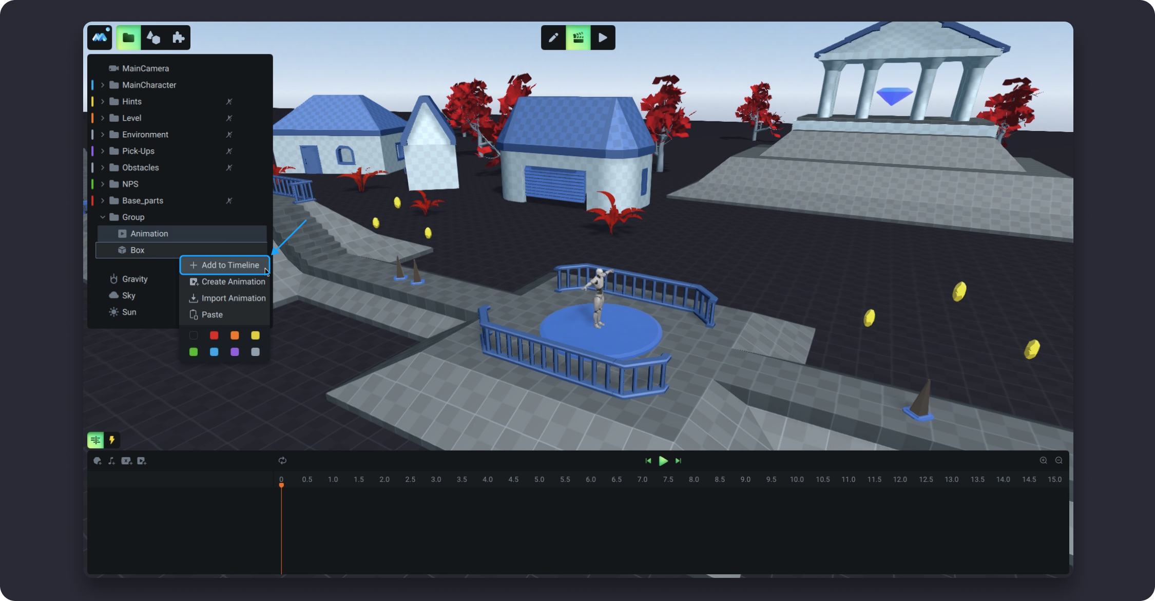 To be able to add an object to the existing timeline, switch to the Animation mode and select the necessary timeline. You can add an object to the timeline in two ways.
