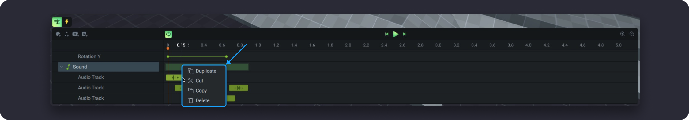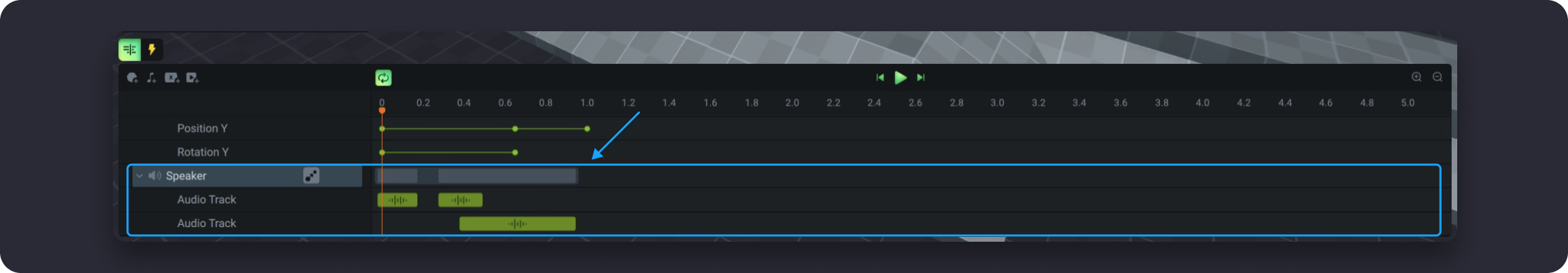 To add an audio clip to the Speaker track, click the Add animation track next to it and select Audio Track. Hover over this track to select a time point at which an audio clip should be played. Select a clip in the window that opens.