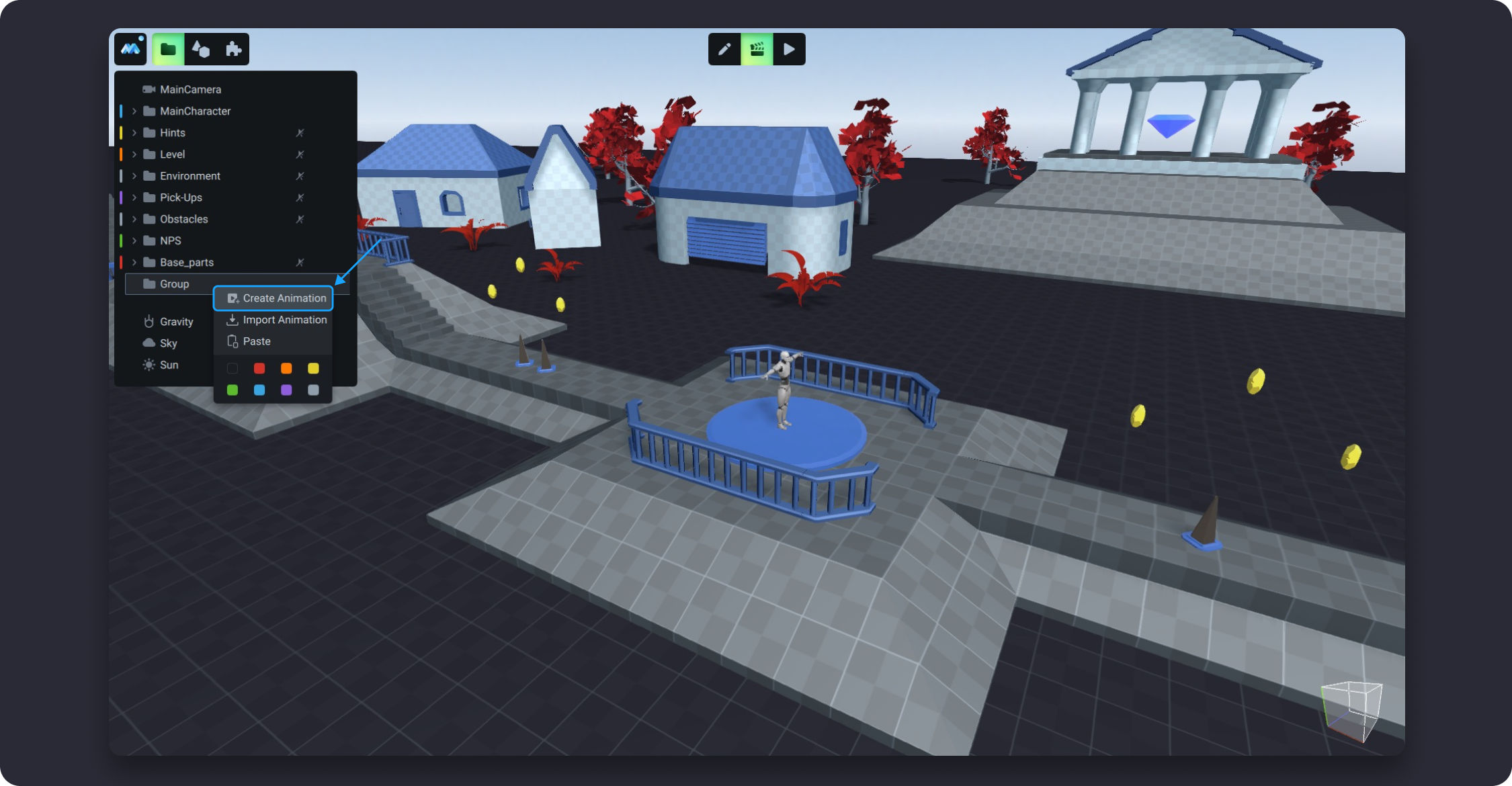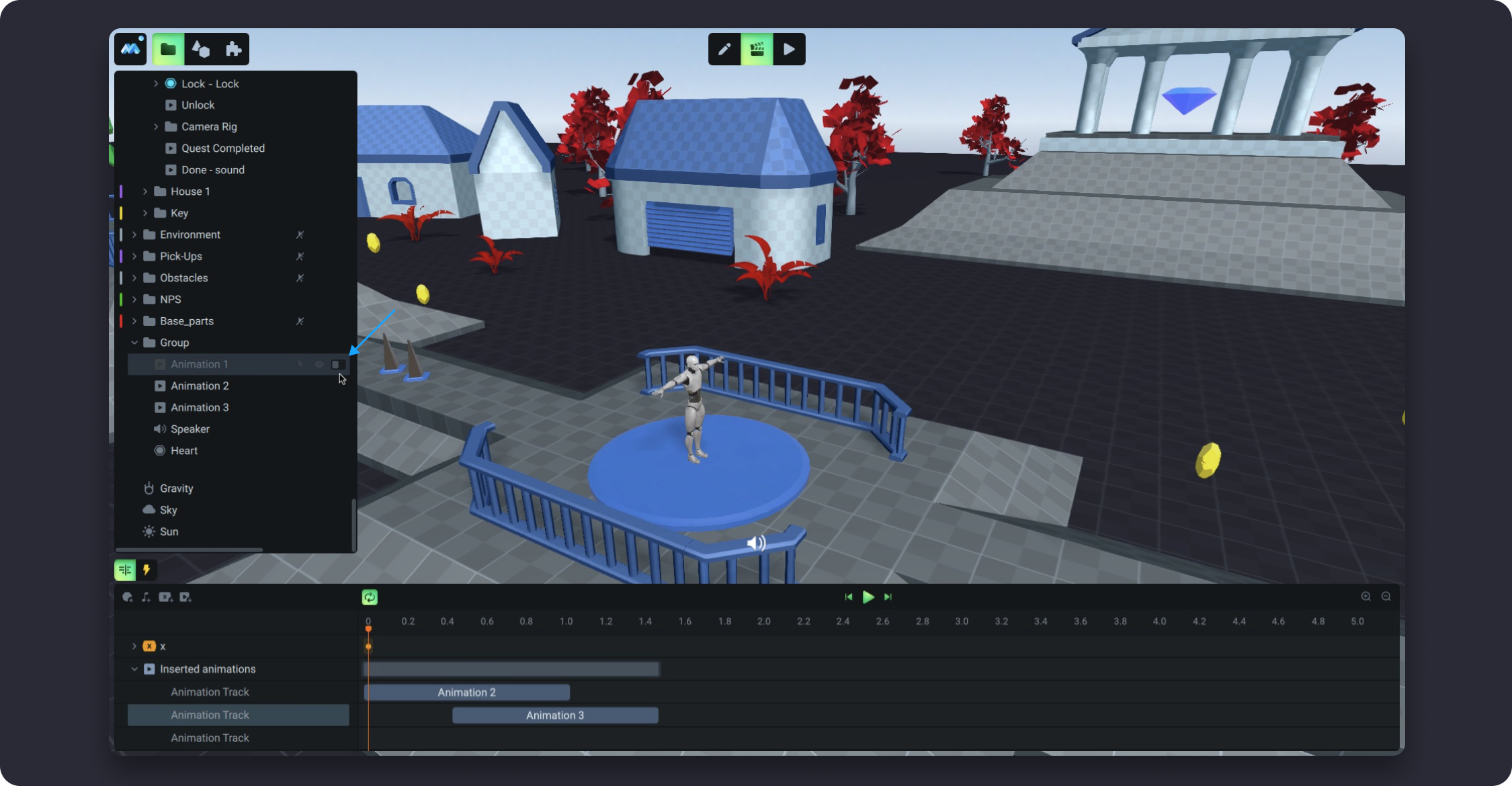 When you create an animation, it is enabled by default. However, if you need to disable an animation you can do it by hovering over the animation in the scene tree and switching off the toggle switch on the right of the animation. After that this animation will not play in Game mode.