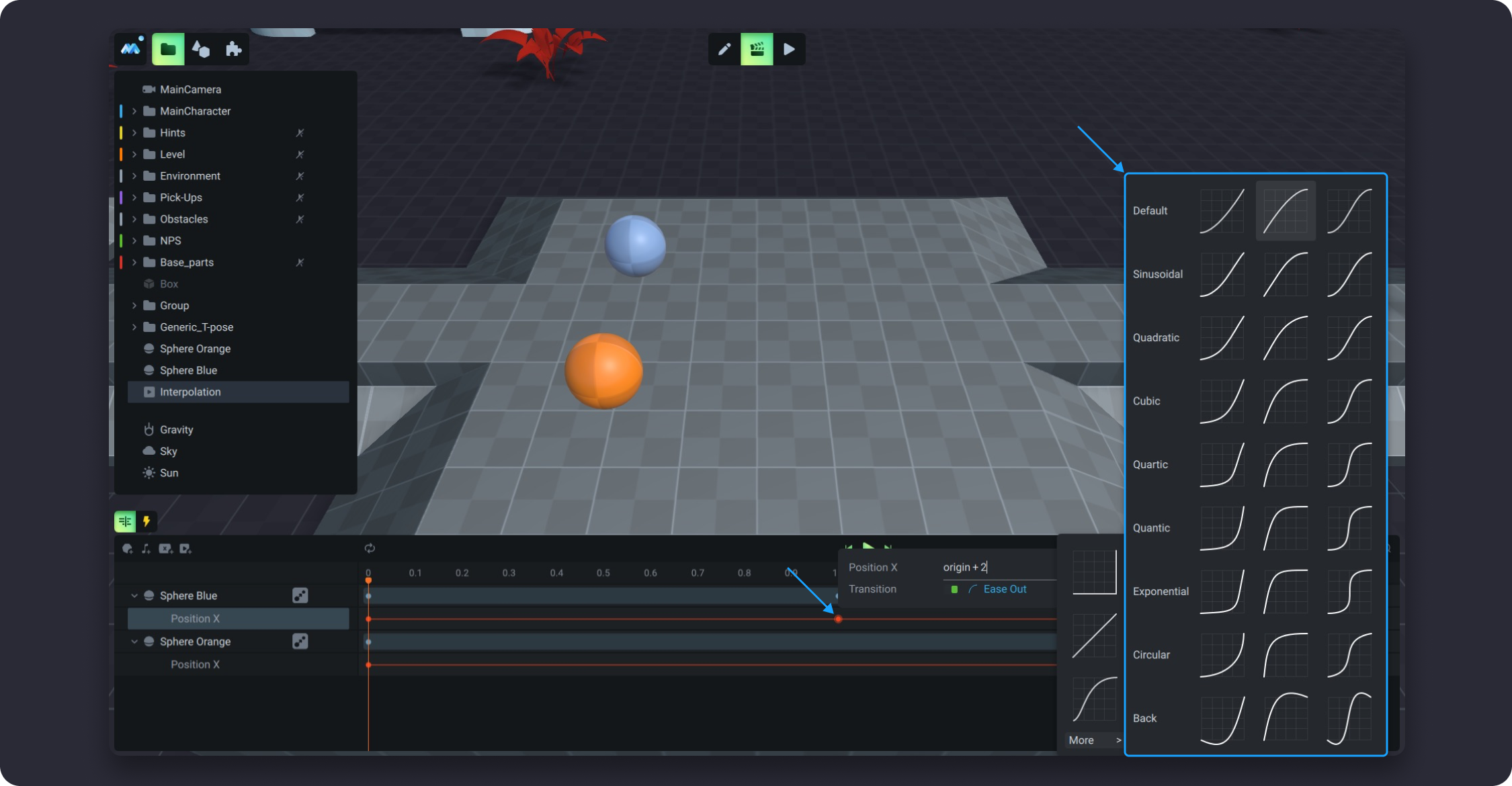 If you click on the transition type in this pop-up window, you will see a choice of three graphs: No interpolation, Linear, and Ease. In these graphs, the X axis represents the time and the Y axis represents the value. There are many transition types available. To see all of the available transition types, hover over More in the Graphs menu and choose the graph that will suit your animation logic.
