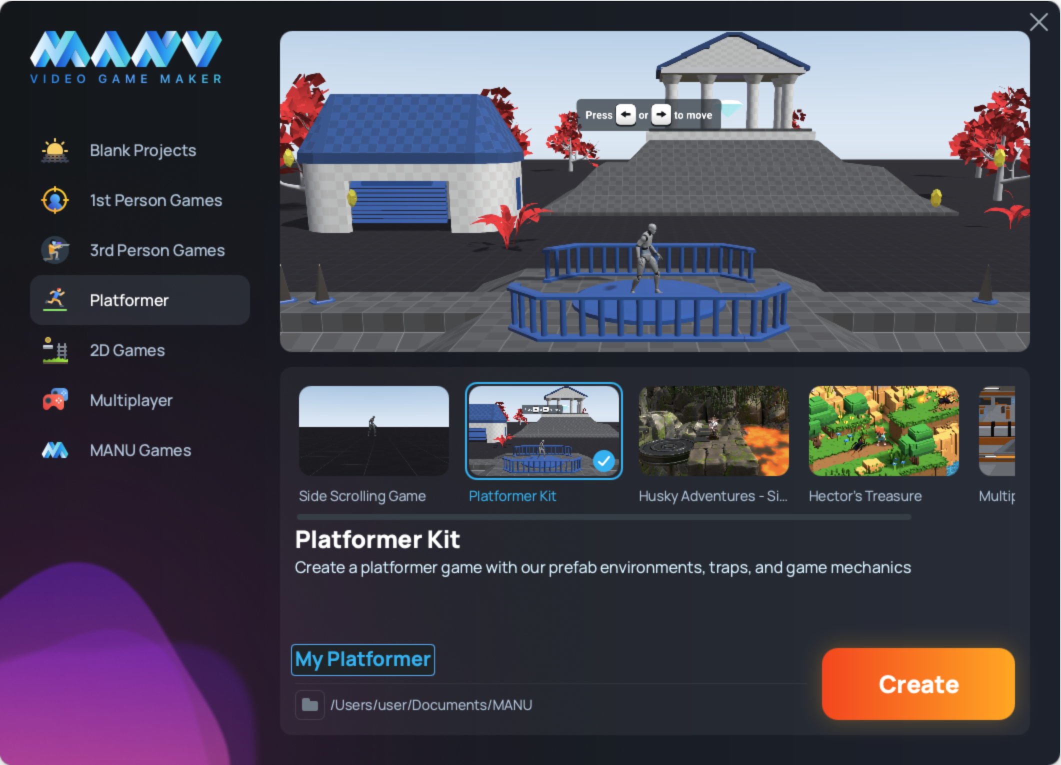 It depends on what type of game mechanics you want to do in your project. If you are the beginner, we recommend you start with **Platformer Kit template**, to learn basics of MANU.